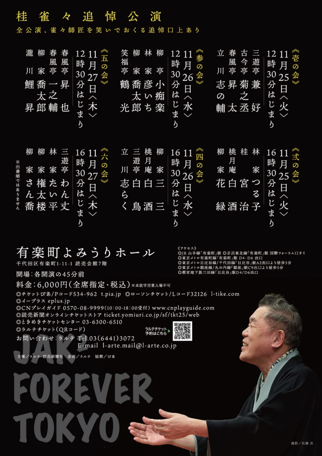 【チケット】 全席指定席 6,000円(税込) ※残席状況により、近くのお席をご用意できない場合もございます。あらかじめご了承ください。 ※車いすでご来場予定のお客さまは、事前にラルテへご連絡ください。